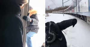 На кадрах видно, что пассажиров выводят из вставшего на путях поезда через кабину машиниста. На другом видео, которое опубликовала «КП», пассажиры прыгают из кабины машиниста прямо в сугробы (недавно такие прыжки уже были у пассажиров в Мытищах).