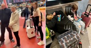 Утром, впрочем, несчастья не закончились. На стойке регистрации пассажирам продолжили давать все новые и новые обещания — рейс был перенесен сначала на 14.00, а теперь он задержан до 16.00. На текущий момент вылет перенесли уже в четвертый раз, но пассажиры готовы и к новым сюрпризам.