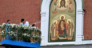 Патриарх Кирилл в подъемнике освятил надвратную икону Спасской башни