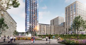 Новые визуализации дают рассмотреть проект в мельчайших подробностях. Помимо стеклянной высотки планируется еще несколько корпусов — они будут меньшей этажности, да и архитектура будет не такая броская, как у доминанты. Их построят слева от высотки. Пространство под «ножками» высотки отведут под ритейл — магазины, возможно, кафе.