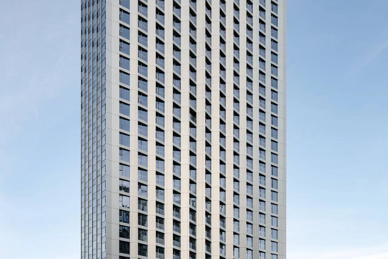 Здание визуально разделено на несколько частей. Нижняя, с первого по шестой этаж, выделяется за счет прямых фасадных линий, которые образуют кубическую форму. Для ее облицовки применялась технология структурного остекления фасадов, что создает эффект зеркального основания дома. В верхней части, с седьмого по тридцатый этаж, применено панорамное остекление с чередой угловых эркеров.
