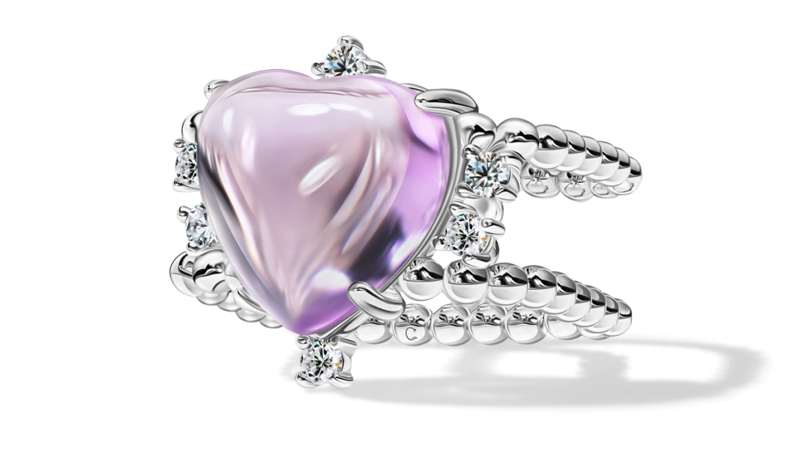 Этим кольцом бренд Panacea Jewelry Lab предлагает признаться в любви. Две дорожки серебряных шариков создают ажурную конструкцию украшения, в сверху его венчает лавандовый аметист-сердце. В пару к такому украшению будет достаточно даже базового черного платья, потому что крупная огранка и небанальный оттенок камня притягивают взгляд.