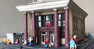 Основным объектом пластилиновой скульптуры является павильон станции «Чистые пруды», выполненный в стиле советского ар-деко и уникальный за счет того, что единственный сохранил оригинальную кубическую форму. Но работа не просто так называется «У метро», а не «Метро», поскольку по-настоящему насыщенным является окружающее пространство.