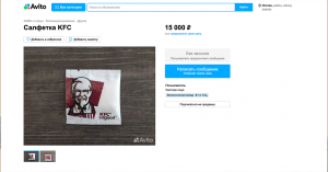 Вероятно, мужчина развил «бизнес-идею» другого москвича, который продавал за 500 тыс. рублей два чизбургера из McDonald’s, и решил попробовать заработать на атрибутике ушедшего KFC. Сложно представить, чтобы в Москве нашлись желающие потратить на такой обыденный предмет 15 тыс. рублей, но, возможно, найдется отчаянный коллекционер, который выбьет себе скидку и приобретет салфетку.