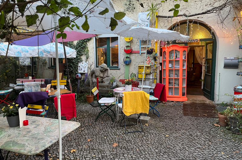 В Шенеберге с середины XIX века есть небольшое протестантское кладбище святого Матиаса (или Мэтью) с могилами братьев Гримм и неудачно покушавшегося на Гитлера Клауса фон Штауффенберга. По шпееровскому плану преобразования города тут все предполагалось снести, но вместо этого кладбище зажало между авторазвязкой, гипермаркетом товаров для дома Hellweg и выныривающими из-под земли путями городских электричек от Центрального вокзала на Дрезден и Мюнхен. На входе сразу за оградой стоит буквально избушка с вывеской Finovo и огороженным внутренним двориком сотки на полторы. Это старейшее кладбищенское кафе Берлина, оно работает с 2006 года.