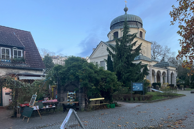 Кроме меня внутри щебечет лишь компания из трех пенсионерок с кофе и штруделями (и которые все равно все фотографируют!). Впрочем, в ноябре в Берлине темнеет даже раньше, чем в Москве. Летом кафе и кладбище работают до 20.00, но сейчас примерно полпятого и уже сумерки, до закрытия осталось всего полчаса. Под звук разгоняющейся почти как по МЦК электрички я направляюсь к выходу.