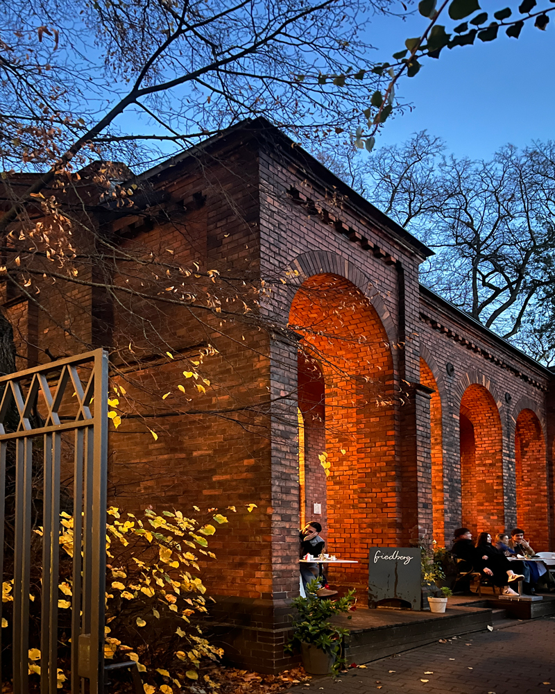 Внутри свободно больше половины столиков, а вот снаружи даже при +11 и в кромешной тьме почти все занято. Возможно, это как-то связано с тем, что этот кладбищенский кластер с востока плавно перетекает в популярнейший у местных парк «Хазенхайде» (площадью примерно с Нескучный сад), а с юга — в парк «Темпельхофер-Фельд». Это поле размером почти два на три километра на месте закрытого аэропорта Темпельхоф вообще занесено в Книгу рекордов Гиннесса как крупнейшее в мире незастроенное пространство внутри города.