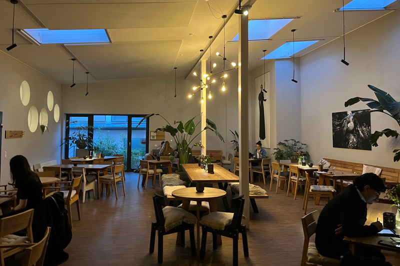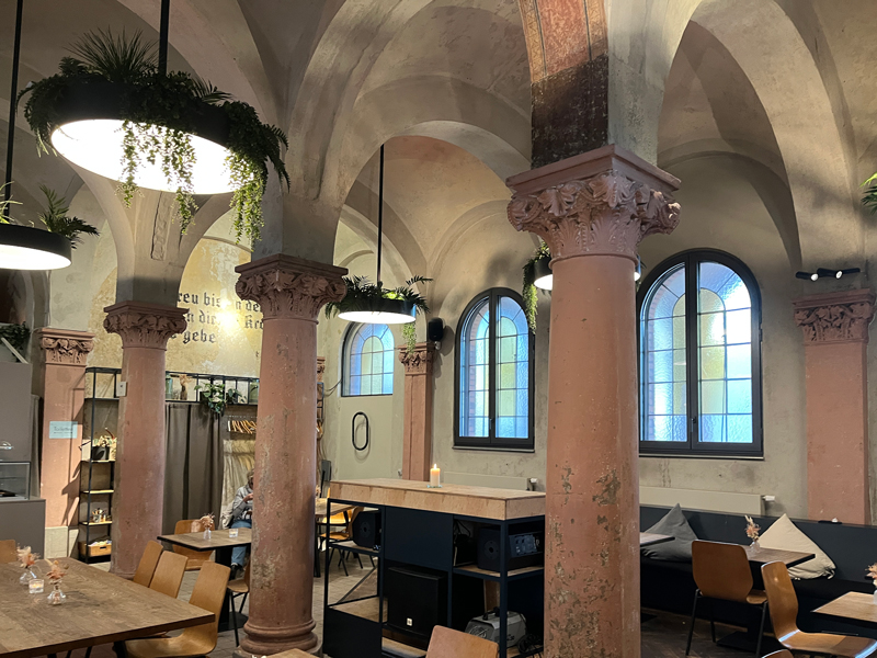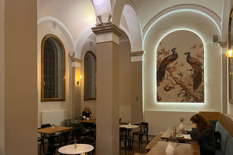 От Finovo 10 минут на велосипеде, но эта часть города уже чуть буржуазнее, и кафе под стать: жизнерадостная роспись на стенах под многометровыми сводами, расслабленная музыка а-ля рестораны где-нибудь в Камергерском переулке, биомороженое. Витрина с лоснящимися круассанами, кишами и чизкейками. От условной Камергерки, опять же, отличает только наличие брецелей с маслом — в Москве за ними, скорее всего, пришлось бы отдельно топать в «Азбуку вкуса».