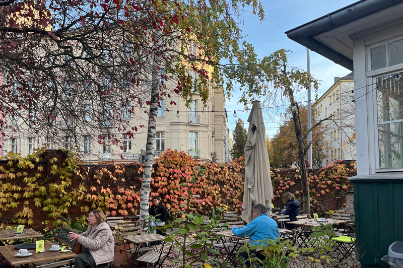 Из-за наследия Стены у Берлина так и не появилось единого центра, и жители любого района внутри огромного кольца эсбана считают им именно себя. И не очень любят просто ради кафе ехать куда-то дальше чем 15–20 минут на велике (получается радиус даже не одного района, а скорее квартала. По-берлински — Kiez). И вот представьте себе, что ваш Kiez абсолютно самодостаточен и даже в соседние лишний раз ездить в лом. Но хочется выбраться из дома на кофе. А ближайший вариант — тихое и зеленое место, пусть и с деликатными каменными плитами, которые тут и там виднеются из листвы. Почему бы и нет? Основная часть посетителей видят друг друга регулярно, так что вокруг такого кафе можно еще и объединиться во что-нибудь — от воркшопов до йоги. Немцев, по крайней мере живых точно, хлебом не корми, лишь бы была возможность социализироваться, налаживать горизонтальные связи и создавать новые структуры, в которых можно будет прописывать устав и заниматься чем-нибудь еще организационным.