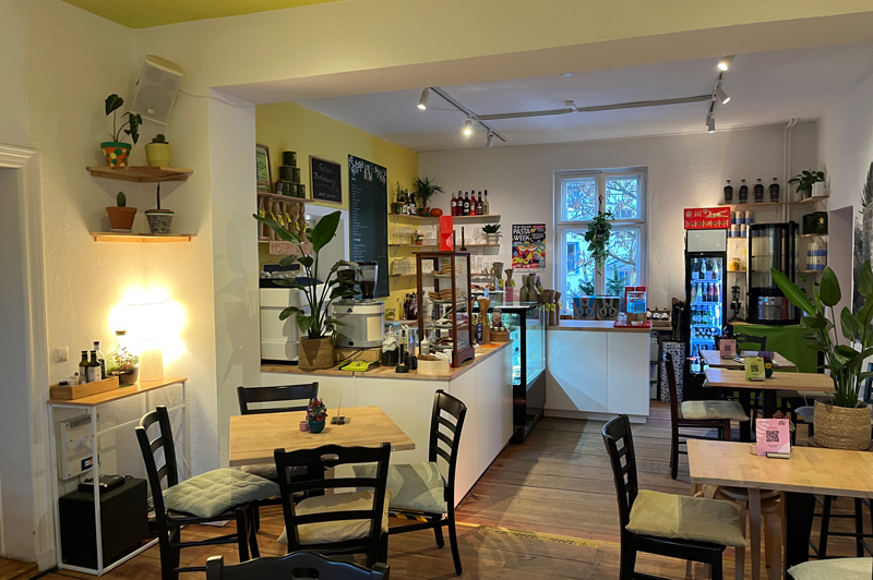 Внутри все предельно камерно и винтажно: салфетки и занавески с вышивкой, книжные стеллажи, разношерстная посуда и коллекция матрешек. Прихожая, проходная комнатка и комната побольше с кофейно-барной стойкой — все вместе хорошо если 30–40 кв. метров. Больше всего похоже на квартиру, откуда только что увезли на погост какую-то бабушку. В крайнем случае — на букинистические лавки на Литейном в Питере (на Москву этот непритязательный обшарпанно-расслабленный уют никак не похож, а на Петербург очень даже. А весь квартал вокруг идущей неподалеку улицы Bergmannstraße с модернистскими фасадами и мрачноватыми дворами-колодцами все русские берлинцы называют Петроградкой).