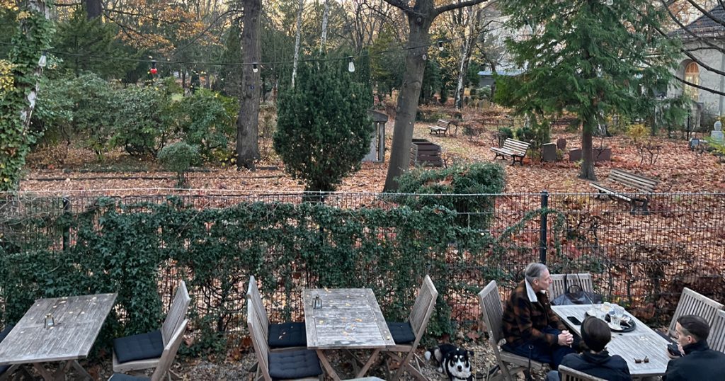 В Шенеберге с середины XIX века есть небольшое протестантское кладбище святого Матиаса (или Мэтью) с могилами братьев Гримм и неудачно покушавшегося на Гитлера Клауса фон Штауффенберга. По шпееровскому плану преобразования города тут все предполагалось снести, но вместо этого кладбище зажало между авторазвязкой, гипермаркетом товаров для дома Hellweg и выныривающими из-под земли путями городских электричек от Центрального вокзала на Дрезден и Мюнхен. На входе сразу за оградой стоит буквально избушка с вывеской Finovo и огороженным внутренним двориком сотки на полторы. Это старейшее кладбищенское кафе Берлина, оно работает с 2006 года.