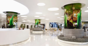 Уникальна также параметрическая оболочка стен и потолка этого зала, выполненная из 1136 отдельных акустических панелей треугольной формы. Созданы две крупнейшие в Москве зеленые стены с живыми растениями высотой более 20 метров. И, наконец, атриум стал идеальным местом для размещения уникального объекта «Диамант» — подвесной переговорной в форме граненого алмаза, растянутой на тросах и соединенной стеклянным мостиком с основными помещениями на уровне 6-го этажа.