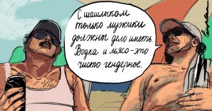 — У меня дед во шашлык мариновал, понял? Это у нас семейное. С мясом только мужики должны дело иметь, я считаю. Это вообще не женское. Водка и мясо — это чисто это. Как его? Гендерное, короче, это все. Вот тут. В мозгу.