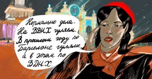 — Да нормально дела. Как у всех. Да мы на ВДНХ гуляем. В прошлом году по Барселоне гуляли, да, а в этом по ВДНХ.