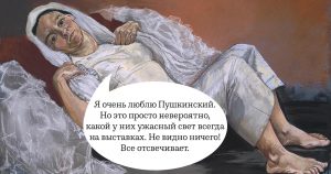 — Я очень люблю Пушкинский. Но это просто невероятно, какой у них ужасный свет всегда на выставках. Не видно ничего! Все отсвечивает. Как они сами-то смотрят? Коссофа совершенно не видно!