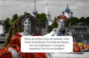 — Сейчас пост, так она такая молилка стала. То нет-нет, а тут прямо на воде и хлебе. Я ей говорю: «Лиза, до добра тоже не доведет твое такое поведение. Господь же видит, что ты в обморок с голодухи падаешь! Он это не одобрит. Это же в тебе прямо гордость какая-то говорит!»
