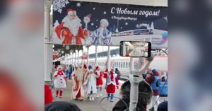 На Белорусский вокзал поезд прибыл около 10.00. Видео публикует издание Msk1: из передвижной резиденции вышел Дед Мороз со Снегурочкой, Снеговиком и другими сказочными существами. Главный Дед Мороз отличается от других, что попроще и без собственного поезда, как минимум более дорогим костюмом.