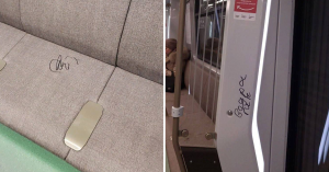 Фотографии испорченных вагонов облетели вчера многие телеграм-каналы. Неизвестные боролись с новыми поездами как могли: заливали клеем USB-зарядки и вставляли в них зубочистки, заклеивали разъемы жвачкой. На сиденьях и корпусе вагона появились нецензурные выражения. А кто-то в первый день запуска заклеил створки дверей, сломав электропривод. Тогда поезд пришлось временно снять с линии.