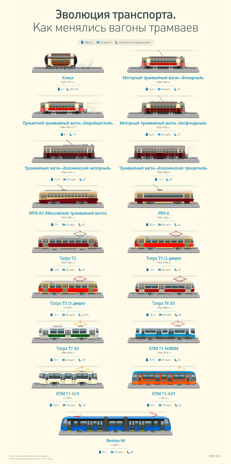 А старые модели трамваев — чехословацкие желто-красные и желто-белые «Татра», к которым москвичи больше всего привыкли, незаметно ушли с московских улиц еще в 2006 году. Сейчас самый старый — это бежевый КТМ, который внешне уж точно ничем не лучше «Витязя».