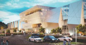 Фасад здания, которое расположится сразу за эстакадой Третьего кольца, собираются сделать «водным» — с помощью шелкографии на панорамные окна фасадов нанесут узор, который будет создавать эффект стекающих струй. В самом здании будут сочетаться асимметричные формы, ломаные линии, острые углы, а строить здание будут из бетона, стекла и металла.