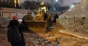 Некоторое время назад здание Киноцентра, приговоренное к сносу, начали обносить ограждениями — сначала полуметровыми камнями, похожими на бордюрные, потом непрозрачным забором. Сегодня за этим забором закипела работа — приехал экскаватор, который стал выкапывать углубление и готовить площадку для подхода демонтажной техники (см. видео). Тем временем работа по установлению самих ограждений продолжилась — оказавшийся на месте работ депутат Сергей Митрохин потребовал у рабочих документы, порубочный билет (предполагалось спилить несколько деревьев и кустарников) и разрешение на проведение работ; документы оказались в полном порядке. Работы шли со стороны ул. Заморенова, так что пока не препятствовали входу и выходу зрителей на сеансы. Последний из них должен состояться в воскресенье, в 20.20.
