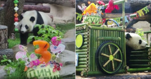 Сотрудники зоопарка устроили для зверей праздник в их вольерах: Жуи подарили бамбуковую машину, а Диндин досталась бамбуковая кукла. Кроме того, панд угостили тортами из арбуза с ледяными цифрами 3 и 4 наверху. В лед были вморожены ягоды и фрукты.