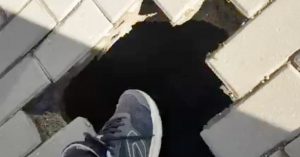 А яма, надо признать, получилась приличная. Сверху отверстие выглядит сравнительно небольшим, примерно 30х30 см, как раз чтобы в нее мог влезть ботинок проходящего пешехода. Но если посмотреть внутрь, то видно, что яма уходит в глубину как минимум на метр, а диаметр полости еще больше — взрослый человек лежа точно поместится. Очевидцы на видео говорят, что слегка наступали на соседнюю плитку и она тоже обвалилась, так что отверстие явно может стать еще больше. А авторы телеграм-канала «Износная колея» пишут: «При сносе здания грунт пошел по швам там, где этого не должно быть — за огороженной территорией, на пешеходной части. Чем это могло закончиться, мы все прекрасно понимаем».