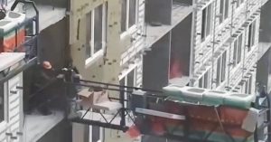 Тот же телеграм-канал показал видео, на котором рабочий еле успевает выйти из опасно раскачивающейся на ветру люльки. Похоже, что снято видео в том же месте, что и первое — с другой стороны, мало ли у нас утепляемых прямо сейчас новостроек.