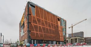 «Главный фасад здания представляет собой медную структурную сетку, — говорят архитекторы. — Она обрамляет светопрозрачные витражи, а на боковых и заднем фасадах, где окон практически нет, эта сетка заполнена медными же, но рифлеными панелями».