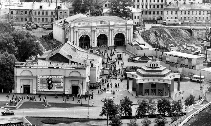 Сейчас вход на станцию синей ветки находится прямо в здании Генштаба Минобороны РФ. Первоначально он, прямо скажем, выглядел совершенно по-другому — это был внушительный (по сравнению с голубой «Арбатской») светлый павильон с широкими арками-воротами и парами колонн. Расскажем интересное сразу — павильон сохранился и находится внутри тетрагона Генштаба, строительство которого было закончено только во второй половине 1980-х.