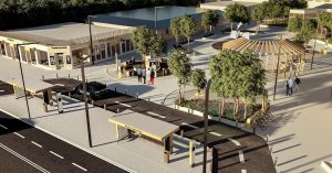 На рендерах — площадь у вестибюля метро рядом с трамвайным кругом. Она, прямо скажем, небольшая, но даже на этом маленьком клочке вполне можно сделать качественное пространство для отдыха. Высадить деревья, отделить одну зону от другой. Автор проекта предлагает установить здесь что-то вроде открытой беседки для отдыха: форма ее крыши частично повторяет форму крыши цирка, расположенного неподалеку.