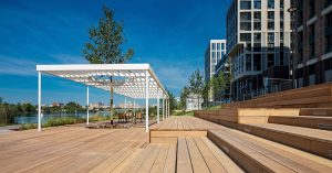 Теперь рядом с новым жилым кварталом тут сразу два уровня набережных с магазинами и кафе с верандами, склон с дождевым садом с растениями прибрежной полосы и взрослыми деревьями — соснами, ивами, ольхами и черемухами, с детскими и скейт-площадками, дорожками для бега, велодорожками, уличными тренажерами и столами для настольного тенниса и уже привычными москвичам шезлонгами, а также перголами, комьюнити-столами и амфитеатрами, цитирует Москомстройинвест сайт Stroi.mos.ru.