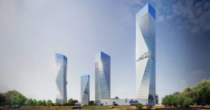 На рендере видно, что башни различаются по высоте и форме: стеклянные фасады дополнены динамичными изгибами, создающими эффект скручивания по вертикали. Самая высокая из башен, в 55 этажей, становится доминантой всего ансамбля.
