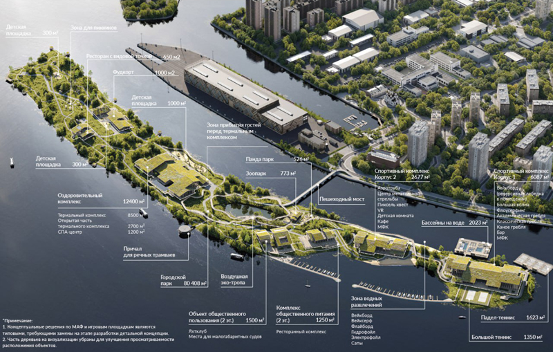 Вся площадь благоустройства, согласно плану, составит 80,4 тыс. «квадратов». Здесь еще может появиться воздушная экотропа (примерно как на ВДНХ), панда-парк, несколько детских площадок, фудкорт, ресторан с «видовой точкой» (но на что будет вид, непонятно — на рендере фигурирует новая судостроительная верфь, может быть, на нее). Еще планируются зона для пикников, корты для тенниса и падела, несколько спортивных корпусов и даже бассейны на воде. В зоне водных развлечений вейксерф, вейкборд, флайборд, сапы и другие активности.