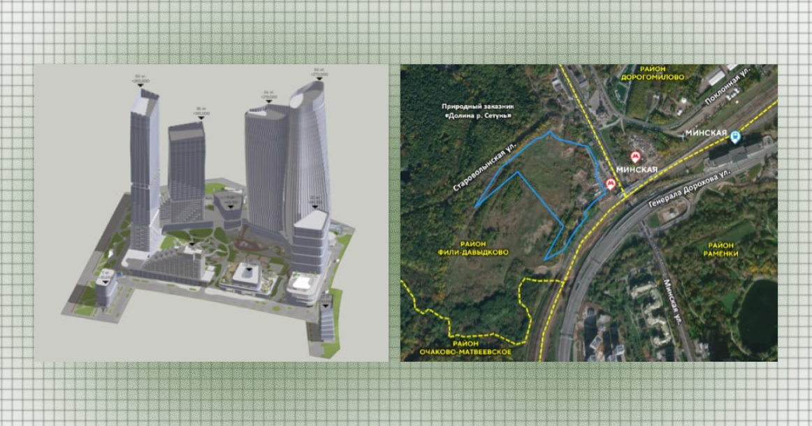 Все вместе это, согласно документации, должно включать 300 тыс. кв. м помещений (поровну жилой и нежилой недвижимости), в том числе школу и детский сад суммарно на 315 мест. Планируется строительство у юго-западного спуска на станцию метро «Минская», на перекрестке собственно Минской улицы с проспектом Генерала Дорохова.