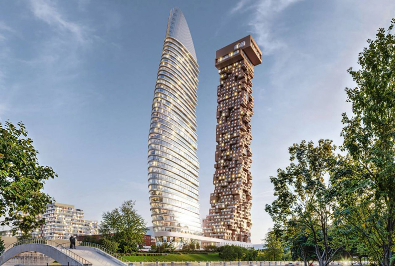 Рендеры опубликовал канал «Недвижимость инсайды» с пометкой «вы не поверите, но это реальные картинки». На визуализациях мы видим две башни — они разные по форме, но вместе выглядят как высотки из научной фантастики. Первая — массивная, выраженно фактурная, будто собранная из сотен выдвинутых и утопленных модулей, напоминающих сложенный в вертикальную колонну космический жилой блок. Вторая же башня полностью противоположная: гладкая, изогнутая, с обтекаемыми стеклянными плоскостями, визуально напоминает парус, крыло или корпус межпланетного корабля.