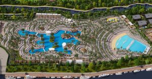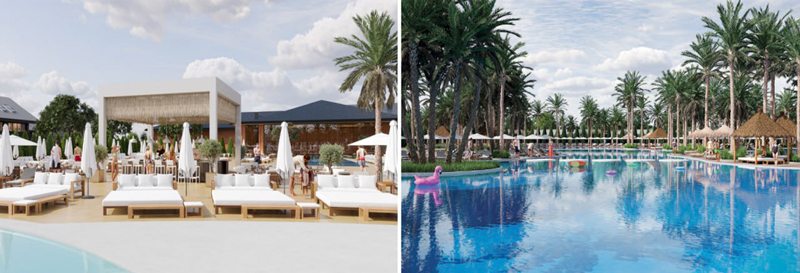 В главной зоне, судя по проекту, появятся огромные бассейны с песчаным пляжем, пальмами, раздевалками и лежаками. Здесь же недалеко и волновой бассейн, и бары, и площадки для детей — куда же без них. Атмосферу курорта дополнят квартал с кафе и магазинами (больше напоминающими какие-то павильоны аутлета), плюс футбольная школа, парк и спа-центр.