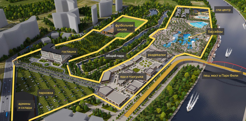 На днях мы писали о начале строительства нового моста, который свяжет Мневниковскую пойму с районом Крылатское. Скоро приступят и к строительству другого моста — из Филевского парка. А возле него, как выясняется, еще может появиться огромный курортный комплекс со спа, фудкортом, магазинами и гостиницей.