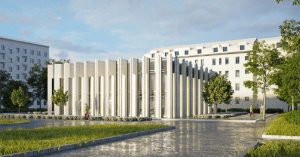 Но на днях телеграм-канал «Стройки — и точка» опубликовал рендеры офисного здания, которые подготовило на эту территорию бюро Kamen Architects. Теперь речь идет уже не об апарт-отеле, а об офисном здании в виде гармошки (если присмотреться вблизи — в виде раскрытой книги с загнутыми колоннами-страницами).