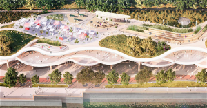 Также рендеры очень напоминают последние проекты реконструкции «Коломенского» или парка Горького (так что не возникает сомнений, что проект делали чуть ли не под копирку). Здесь мы наблюдаем те же многоярусные павильоны, плавные изгибы. Предлагается обустроить кафе с верандами, сделать спортивные зоны и даже построить «волнистый» МФЦ. Зелени, правда, останется как-то маловато.