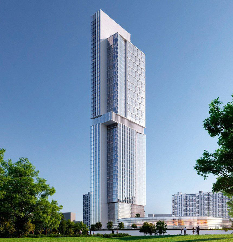 Рендеры опубликовал телеграм-канал «Стройки — и точка». Пишут, что это конкурсный проект, который готовило для этой территории бюро Сергея Скуратова. В целом стиль этого бюро легко узнать: архитекторы предложили построить стеклянный небоскреб в виде необычной полки для книг, где корешки расположены в разные стороны. Конкурс проходил в закрытом режиме, там что неизвестно, будет ли этот проект реализован — официально власти об этом не объявляли.