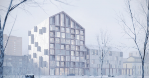 Дома, показанные на рендерах, со скатными крышами, но асимметричные, к тому же развернутые в разные стороны — параллельно и перпендикулярно Плющихе. Видно, что в отделке используется много стекла, а фасад, судя по всему, из клинкерного кирпича. В здании повыше аж девять этажей, а в пристройке пониже — пять. Такой ЖК уже сложно будет назвать клубным домом.