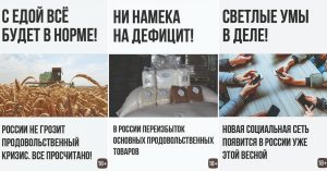 Довеском к плакатам о продуктовом изобилии стоит изображение с надписью «Светлые умы в деле! Новая социальная сеть появится в России уже этой весной». Скорее всего, речь идет о «Россграме», которую директор Ассоциации профессиональных пользователей соцсетей и мессенджеров Владимир Зыков уже назвал фейком и заявил, что ситуация напоминает мошенничество. Даже логотип у «российского аналога» оказался бесплатным стоковым вектором, в котором «разработчики» поленились поменять цвета.