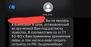 На скриншоте, опубликованном телеграм-каналом «Новости Москвы», указано, что смс приходит с адреса mos_info. В увеломлении ссылаются на ст. 7.1 53-ФЗ и сообщают, что к призывнику «применены временные меры, в том числе в виде запрета на выезд из РФ». Призывникам также сообщают о дальнейшей уголовной ответственности за неявку и требуют прийти в военкомат на Угрешской улице.