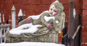 Зимняя прогулка по погосту почти всегда предприятие тихое и одинокое: родственников, приезжающих ухаживать за могилами, практически нет, а для экскурсий слишком холодно. Армянское кладбище в этом смысле немного отличается от других: во-первых, здесь не так тихо, потому что на главной аллее на скамейке сидит человек и играет на дудуке. Говорят, что это продолжается уже больше 20 лет и что играет он каждый день. Во-вторых, здесь не так безлюдно, потому что поток прихожан в кладбищенскую церковь не ослабевает в течение всего дня, и, кажется, мужчин среди них гораздо больше, чем женщин. И, наконец, цвет — помимо привычного монохрома — белый снег, черные и серые надгробия — тут много красного: монументальный забор, видный отовсюду, церковь, дом причта — все это построено из красного кирпича.