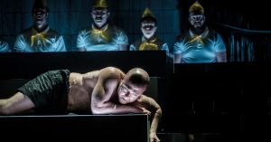 Перед спектаклем его продюсеры советовали зрителям перечитать роман. Обычно это бывает нужно, когда режиссер самовыразился за счет деконструкции сюжета — как Богомолов в своем знаменитом «Идеальном муже». Но здесь другое дело. Диденко — выходец из Derevo, труппы-пионера физического и визуального театра, и как режиссер он работает прежде всего через костюм, декорации, свет, спецэффекты, а также движение и танец. Что не мешает ему задействовать драматических актеров, заставляя их тела совершать пластические чудеса. В Театре Наций он ставил «Идиота» с Ингеборгой Дапкунайте в главной роли. В «Норме» на Малой Бронной умопомрачительную пластику вместе с не менее фантастическим уровнем владения текстом демонстрирует Евгений Стычкин. Вместе с молодой Марией Лапшиной, воплощающей образ пионера в желтой пилотке и галстуке, он становится проводником по разрозненным частям романа и играет всех их центральных персонажей. Танцуют, поют, двигаются, размахивают флагами и выстраиваются в фигуры вместе с ними артисты «Мастерской Брусникина» и труппы Театра на Малой Бронной.