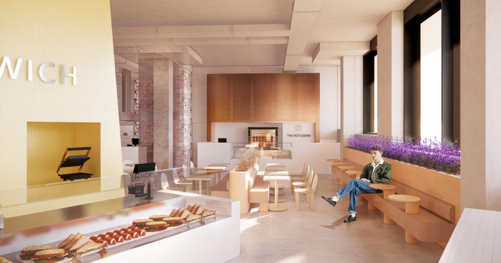 Это новый фудкорт — компактный по площади (всего 13 корнеров), но довольно разнообразный по начинке: от кофе и выпечки до грузинской, мексиканской, паназиатской и средиземноморской кухни, плюс бургеры, паста, пицца и бар. На рендерах уже можно разглядеть Pho Viet, который, видимо, станет одним из корнеров сектора «Азия». Среди резидентов обещают и сетевые проекты, и авторские форматы, и места от рестораторов, решивших попробовать компактный формат впервые, что интригует.