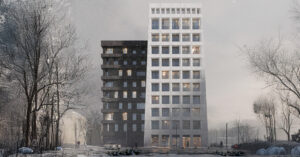 Этот проект подготовило уже архитектурное бюро СИВИЛ. Судя по рендерам, запланирован компактный 10-этажный клубный дом, собранный из двух контрастных объемов — белого и черного. Один почти «сахарный», второй угольно-темный, с такой шершавой фактурой. Просто инь и ян премиальной недвижимости.