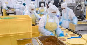 В цехах смешивают тесто и запекают овощи, смазывают соусом тортильи и складывают в миски листья Айсберга и прочие ингредиенты для салатов, сворачивают сэндвич-роллы и лепят сырники, опускают во фритюр кусочки курицы в панировке, а на сковородках специальными пищевыми лопатками переворачивают жарящиеся котлеты. За сутки на фабрике производят более 40 тысяч тех самых сырников, а максимальная отгрузка достигала 48 тыс. Что касается сэндвичей, то «треугольников» складывают около 20 тыс в день, а роллов скручивают 15 тыс.