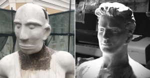Ну по крайней мере теперь «Рабочий» будет выглядеть так, как выглядел, когда его и поставили на крышу здания. В Мультимедийном комплексе актуальных искусств были найдены документальные съемки 1949 года, благодаря которым статуя обрела наконец истинную голову (то, что справа).